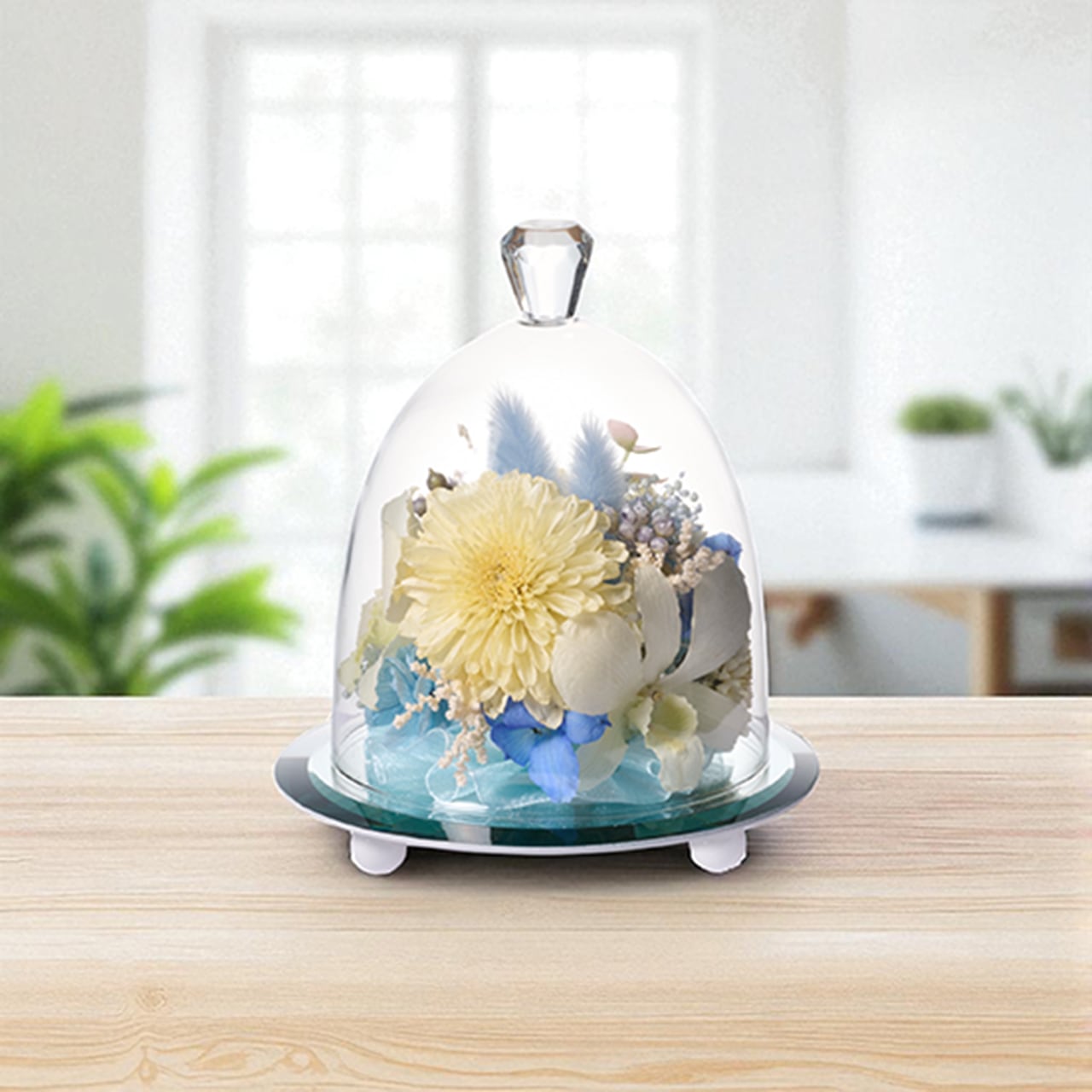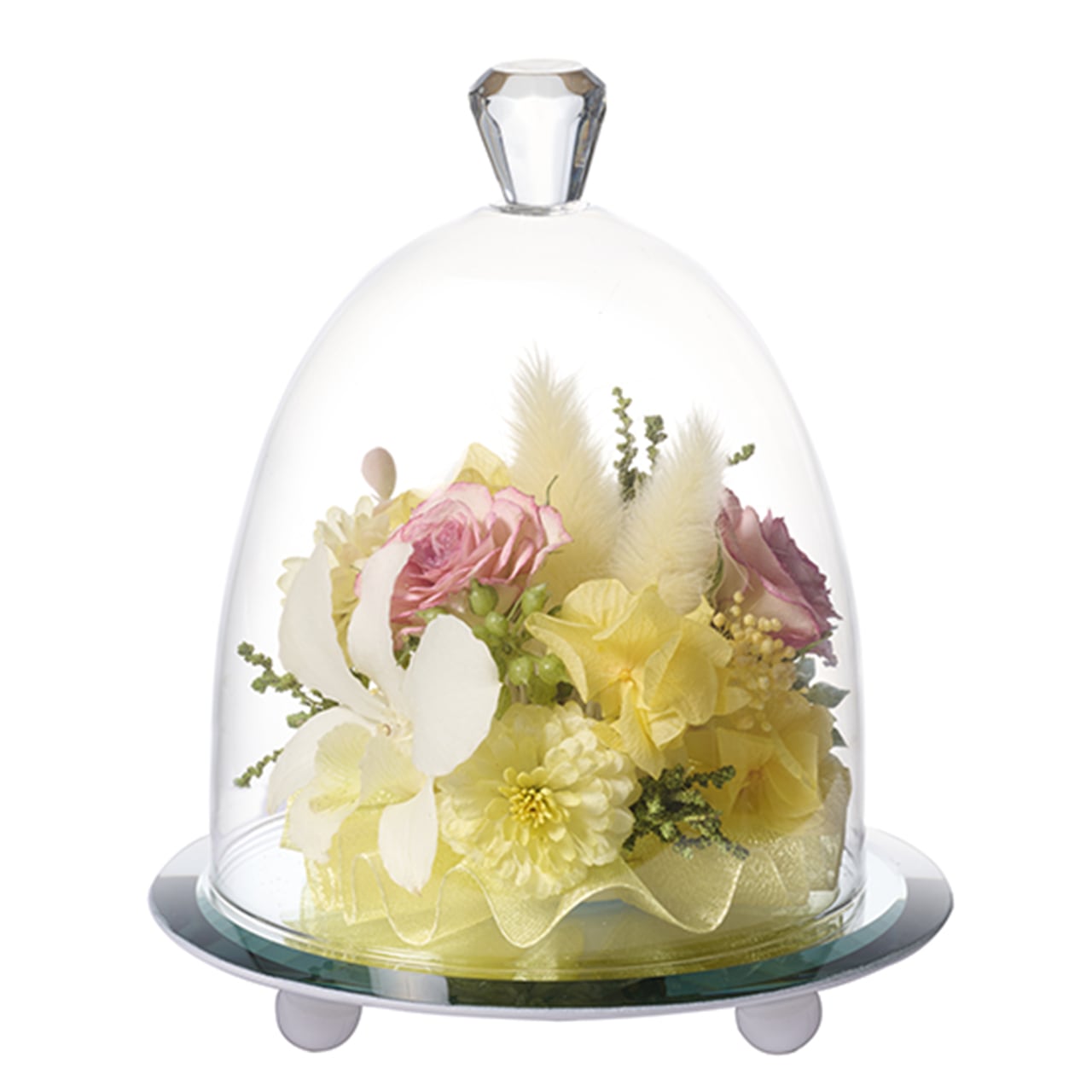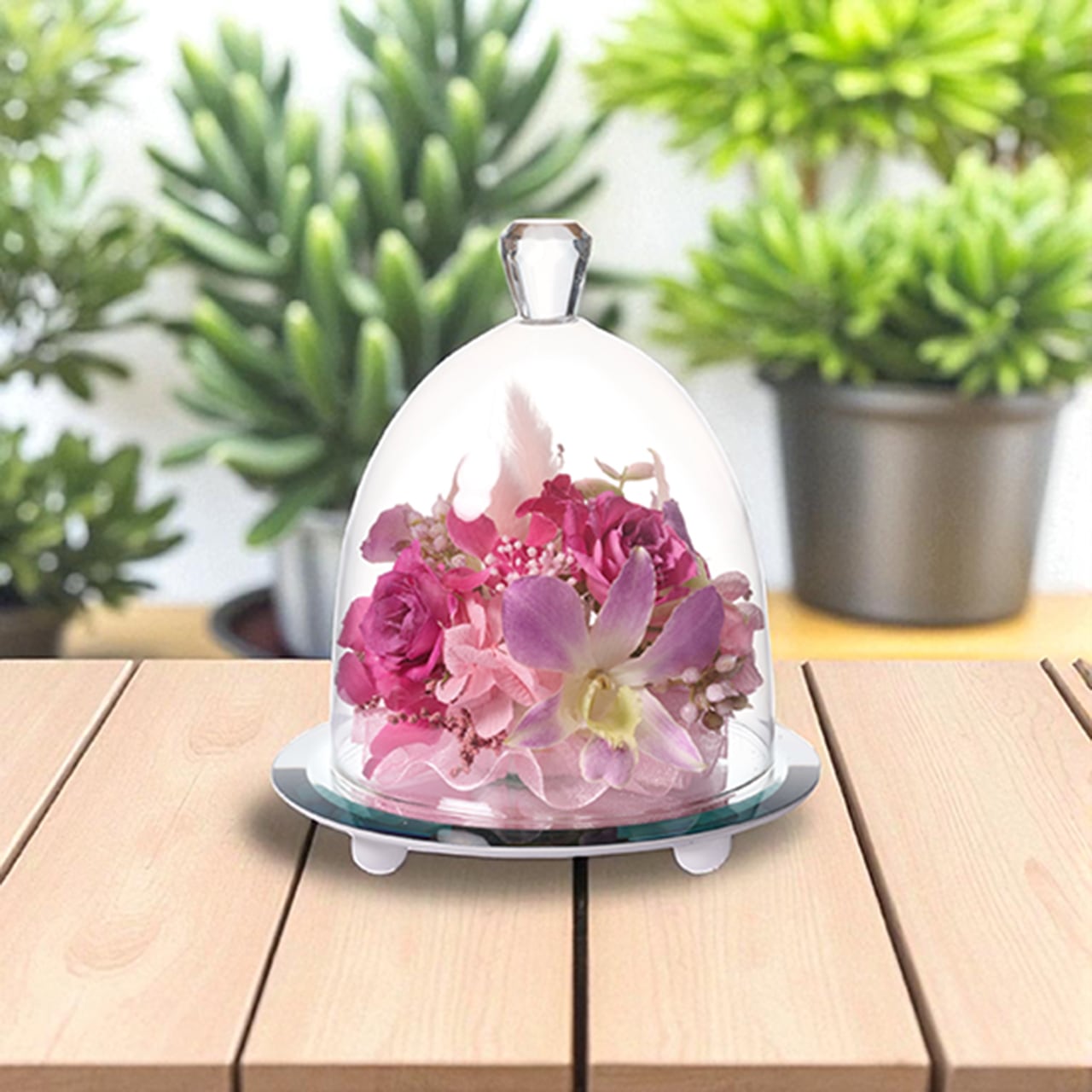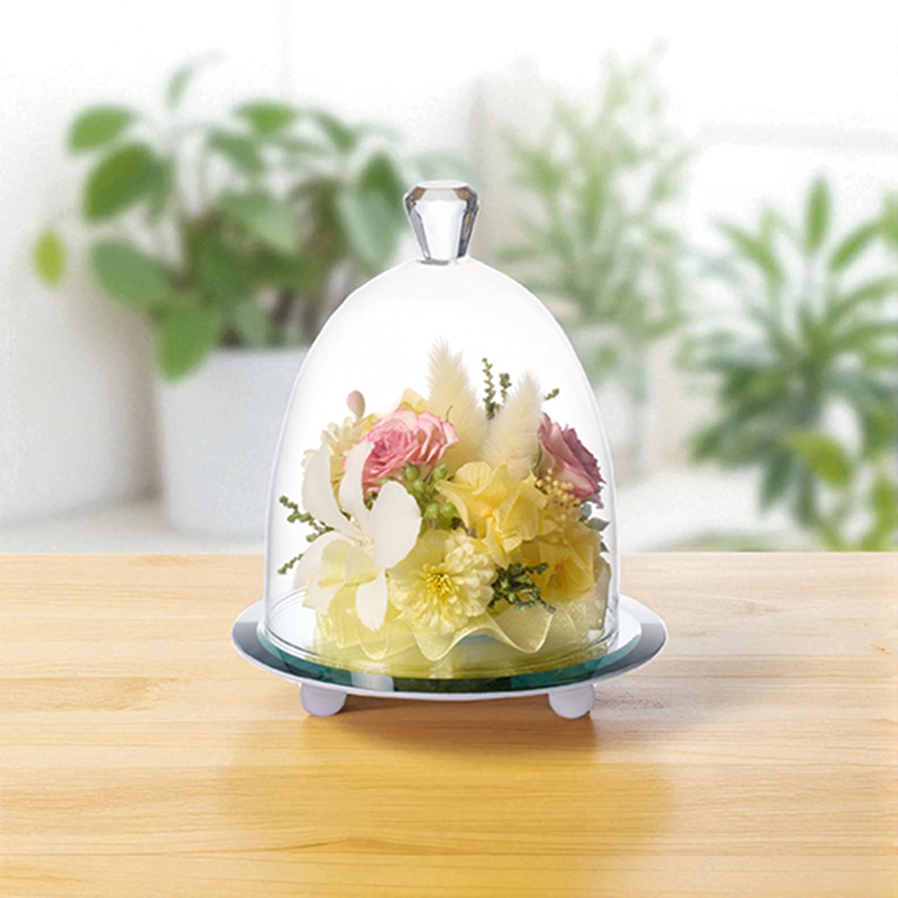鏡の台座が花々を立体的に映し出し、飾るだけで空間を柔らかく演出します。