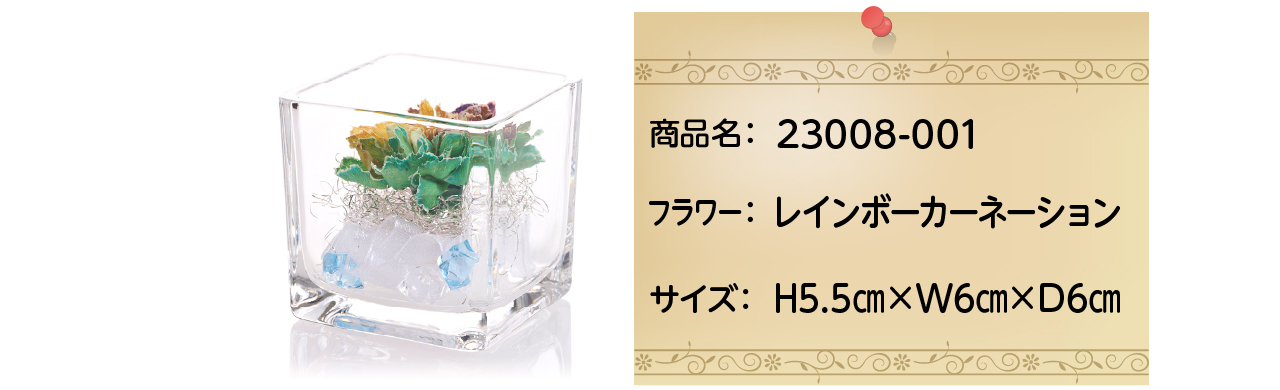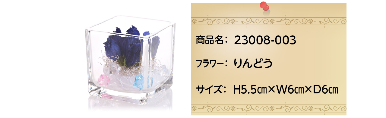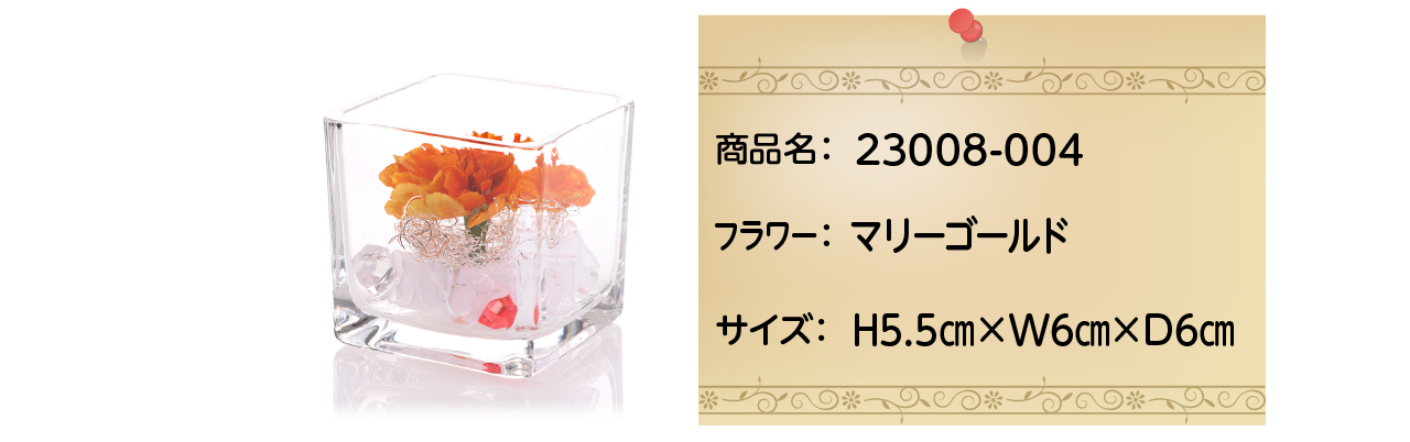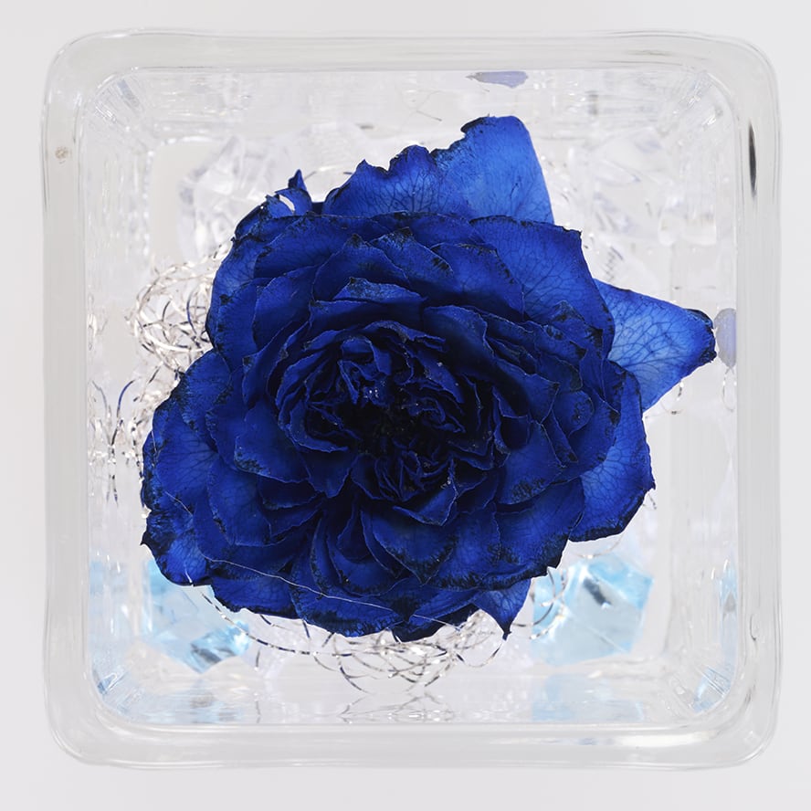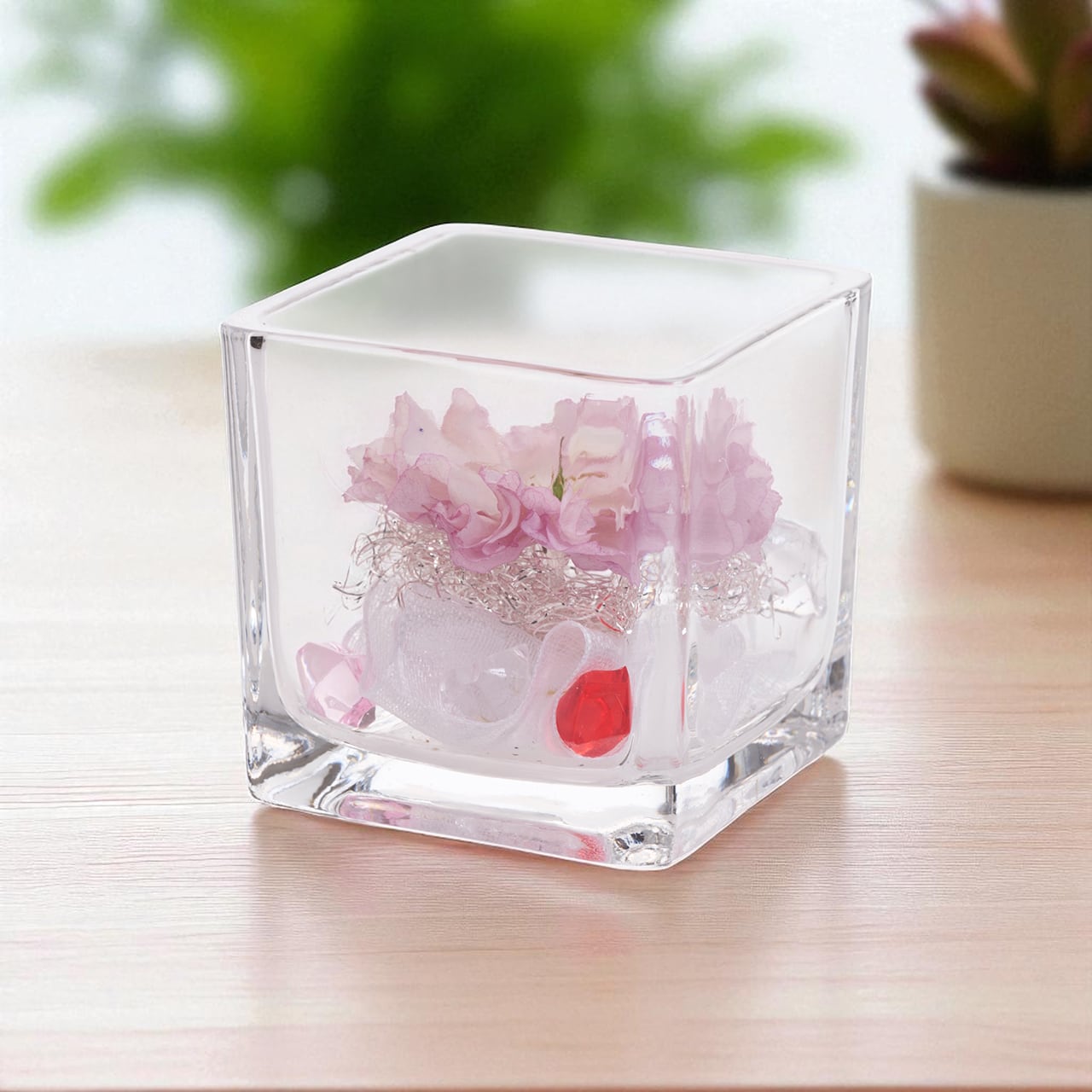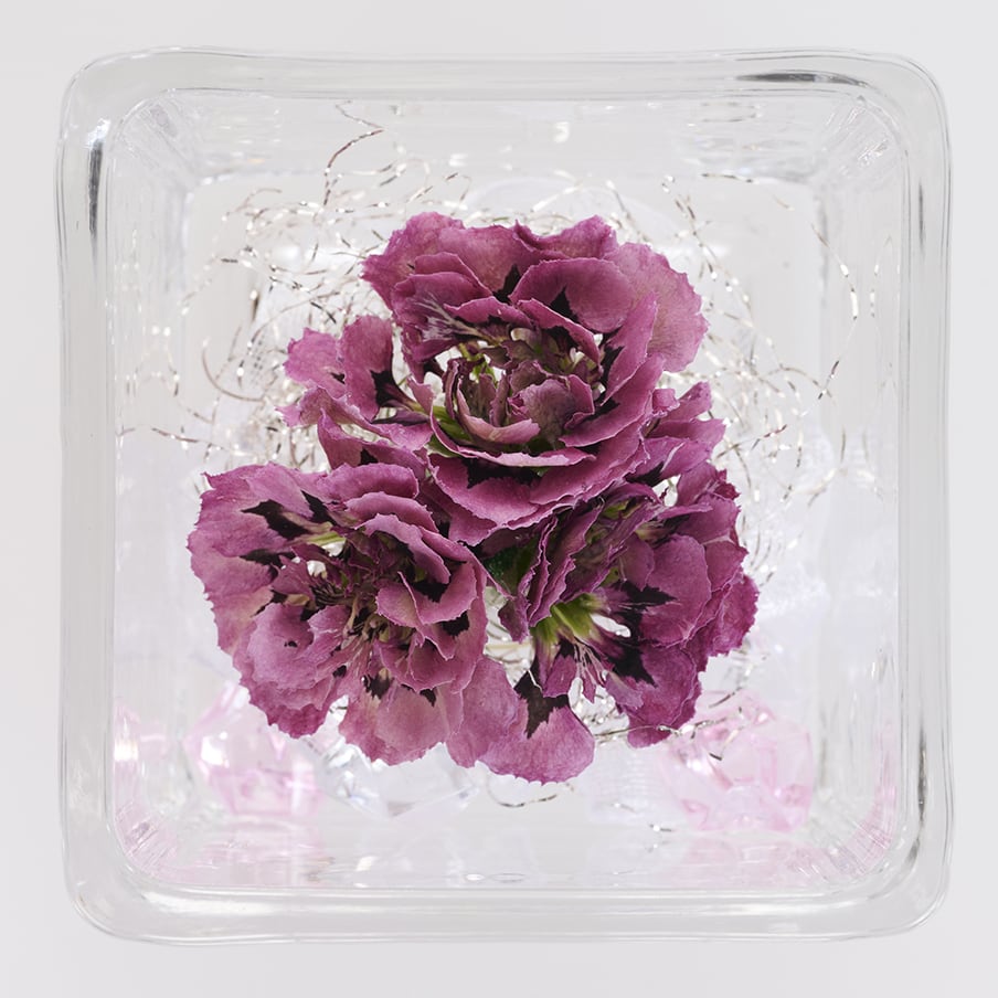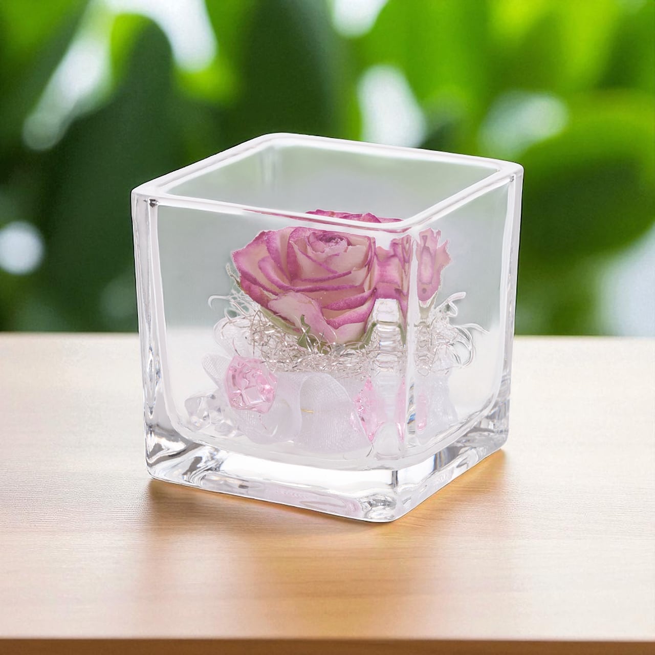 ガラス製の小さなキューブに、一輪の花をアレンジしたボトルフラワーで